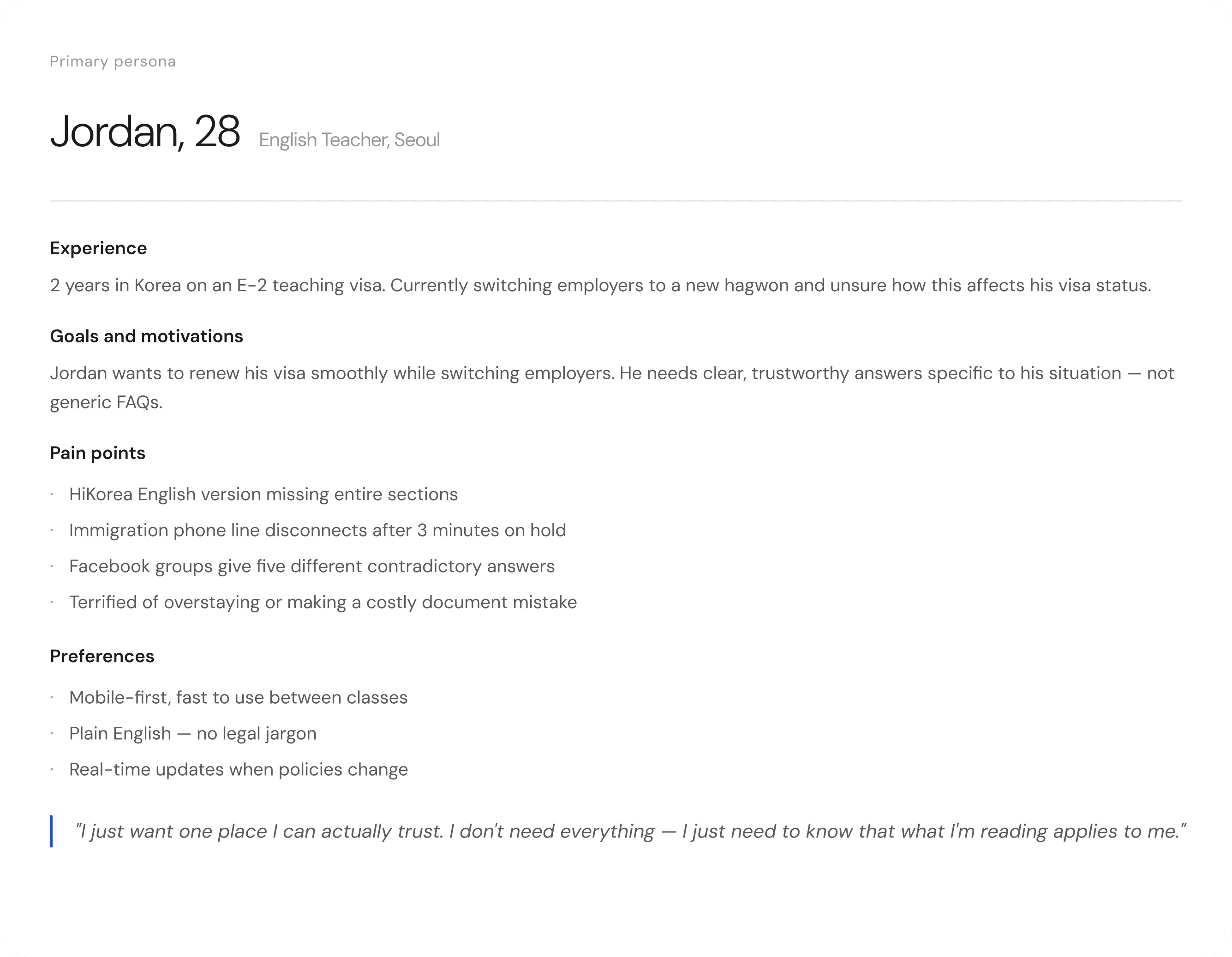 By understanding the specific frustrations and anxieties of foreigners navigating the Korean visa system, VisaPath Korea can address their exact challenges with a trustworthy, efficient, and personally relevant experience.